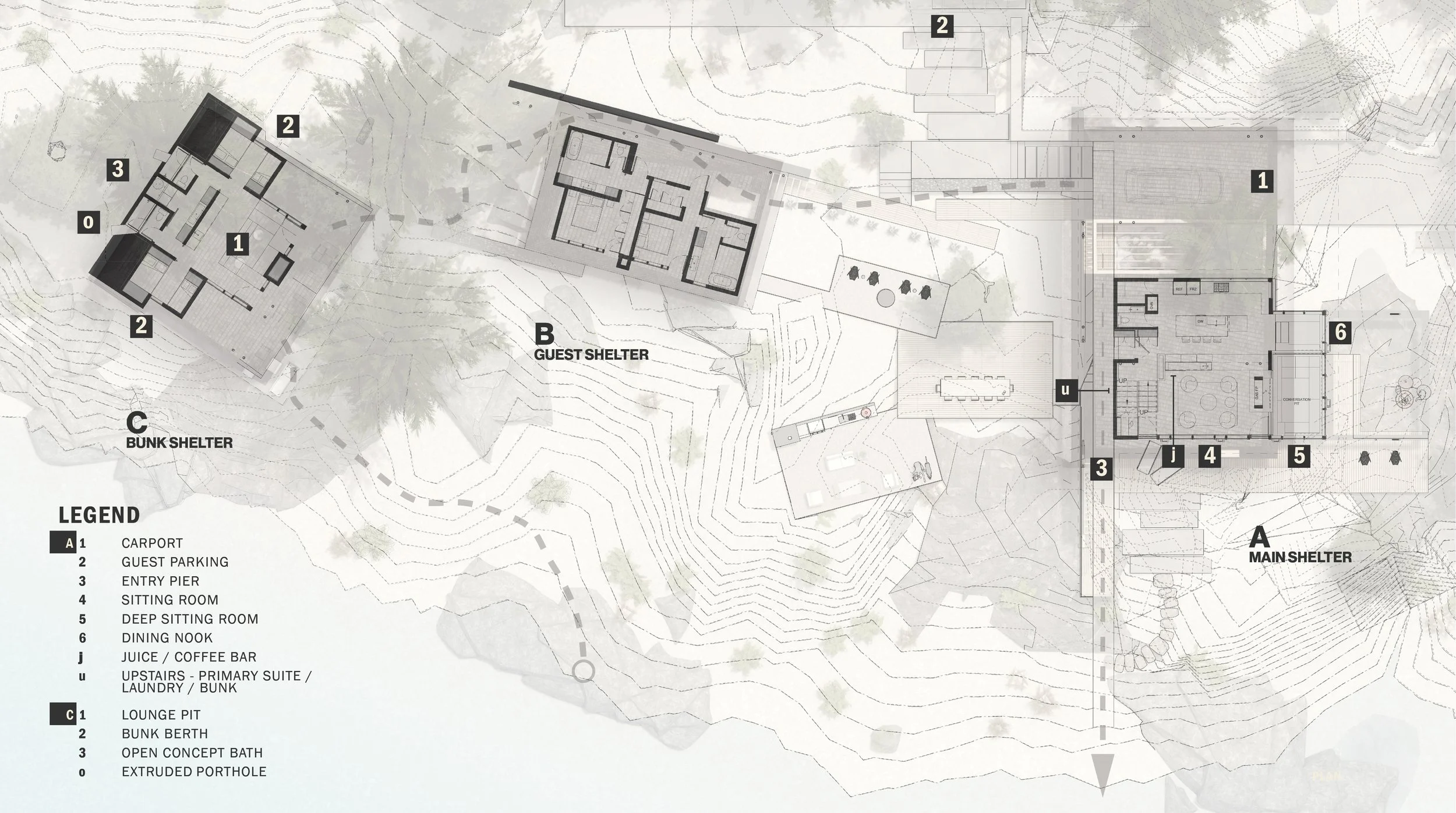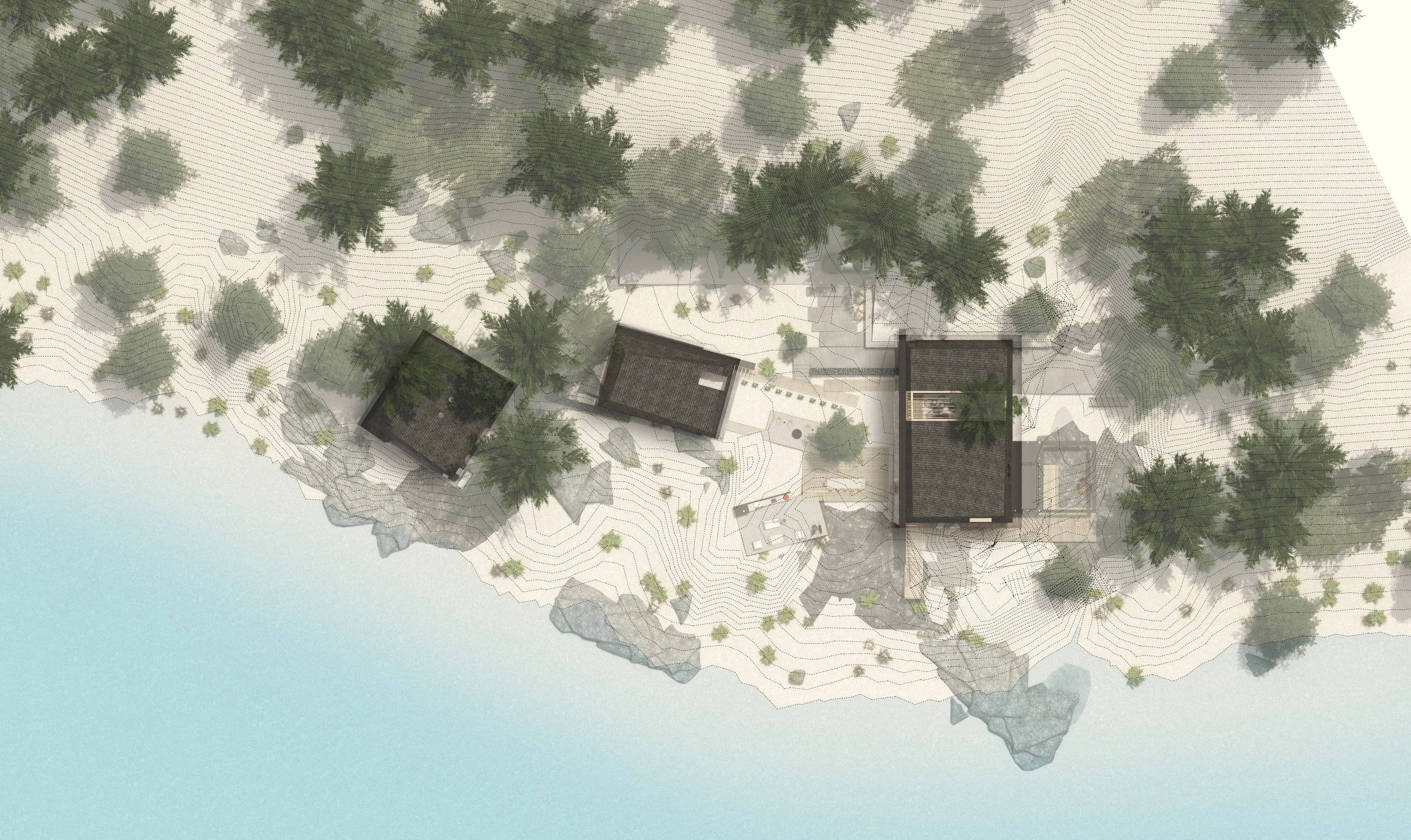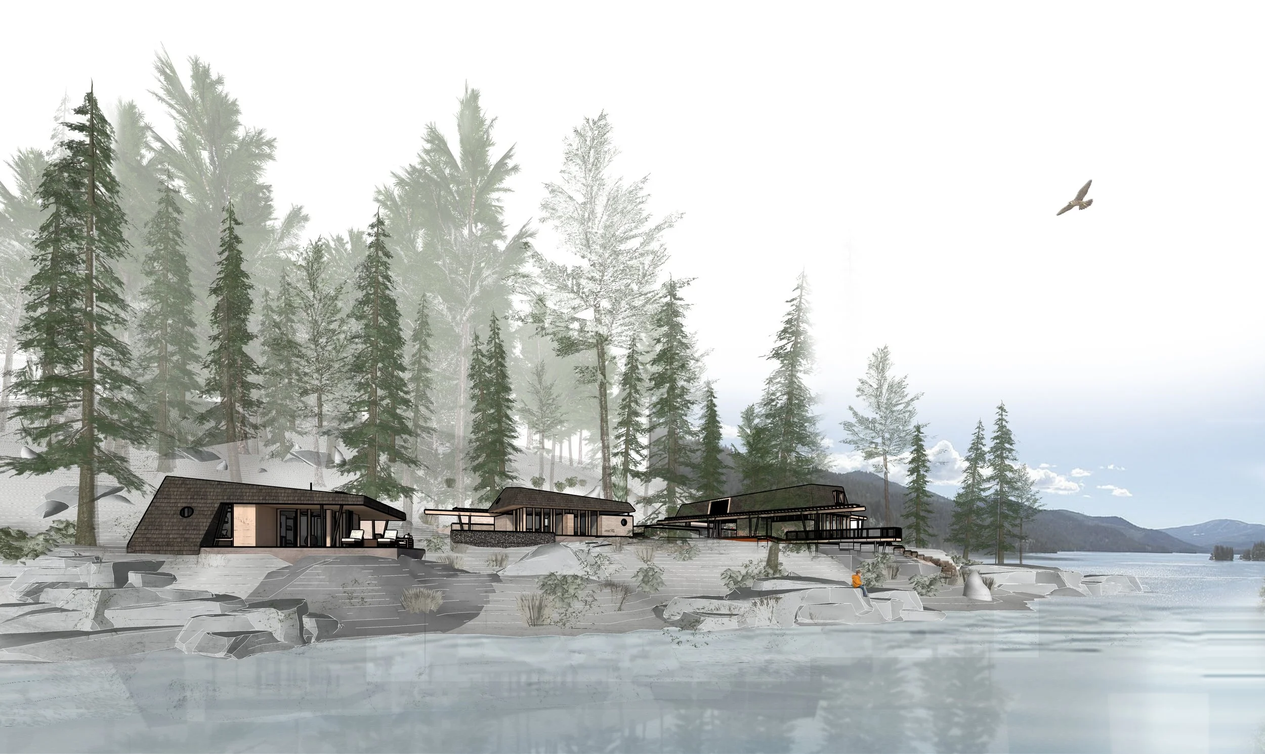 Three structures are carefully positioned along the shores of Spirit Lake, ID to create a unified cabin complex. A main cabin serving anchors the prominent point, while a double-suite guest cabin is nestled discretely against the hillside. Further removed, the lively bunkhouse is strategically designed to pack in guests and focus activity around a central conversation pit.